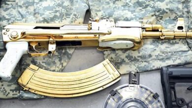 • En operativo, policías estatales incautaron una camioneta con blindaje siete y un “cuerno de chivo” chapeado en oro