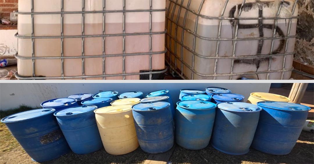 Derivado de trabajos de inteligencia interinstitucional se ejecutó una intervención que permitió el aseguramiento de 1,980 litros de hidrocarburo, así como 24 contenedores, dos de ellos tipo “muela” con capacidad de mil litros, los cuales se encontraban abastecidos casi en su totalidad.