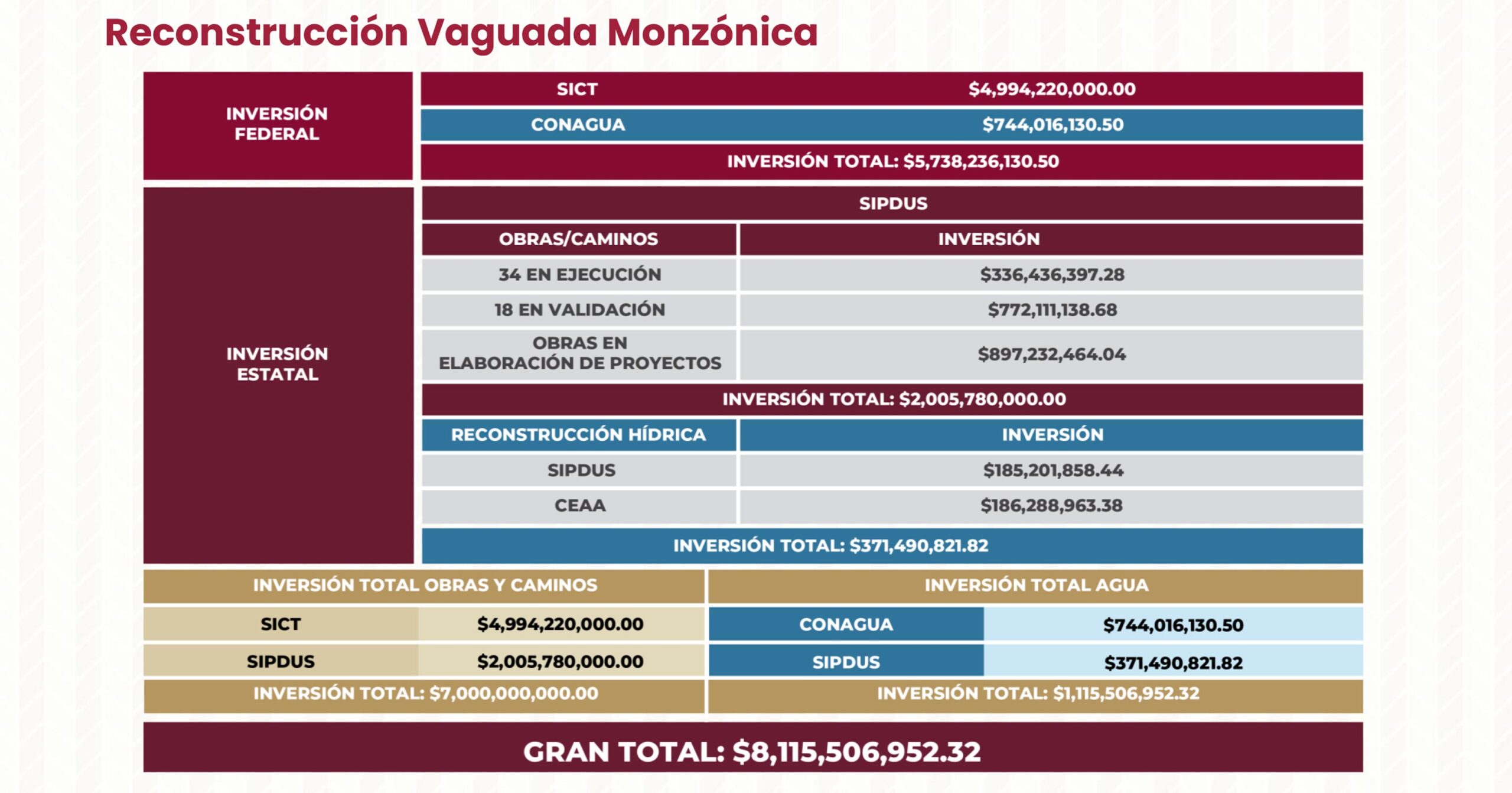 Por su parte, el gobierno del estado aportará alrededor de 2 mil 5 millones de pesos en obras y caminos, mientras que la reconstrucción hídrica coordinada entre SIPDUS y la Comisión Estatal del Agua y Alcantarillado (CEAA) superará los 371 millones 490 mil pesos.