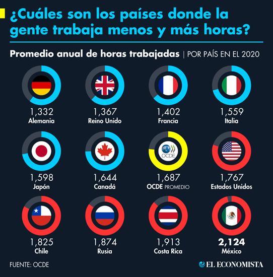 Si vemos las estadísticas de la Organización para la Cooperación y el Desarrollo Económicos (OCDE), nos encontraremos con datos nada satisfactorios para México, pues es el país que más horas destina a las actividades en los espacios de trabajo, en comparación con las horas laborales de los países del primer mundo.