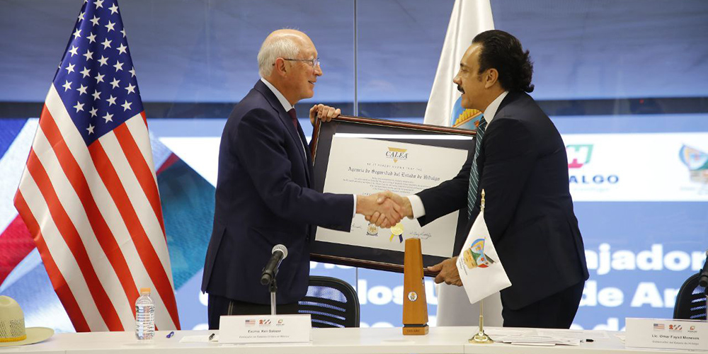 En las instalaciones del C5i concluyó la gira de trabajo que el embajador de Estados Unidos de Norteamérica, Ken Salazar, realizó a Hidalgo, en donde entregó al gobernador Omar Fayad la certificación internacional TRI-ARCO de la Comisión para la Acreditación de Agencias de Seguridad Pública (Calea).