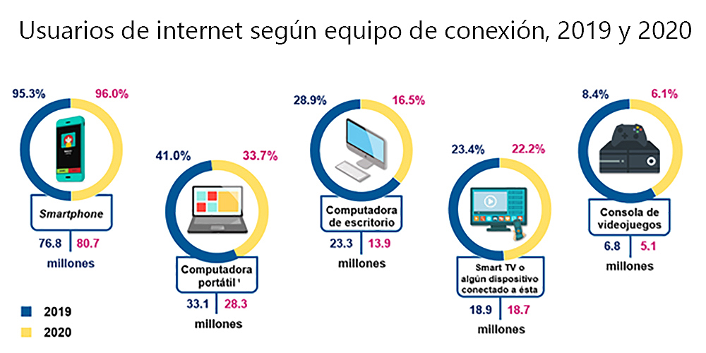 Los tres principales medios para la conexión de usuarios a internet en 2020 fueron: celular inteligente (Smartphone) con 96.0%, computadora portátil con 33.7% y televisor con acceso a internet 22.2%.