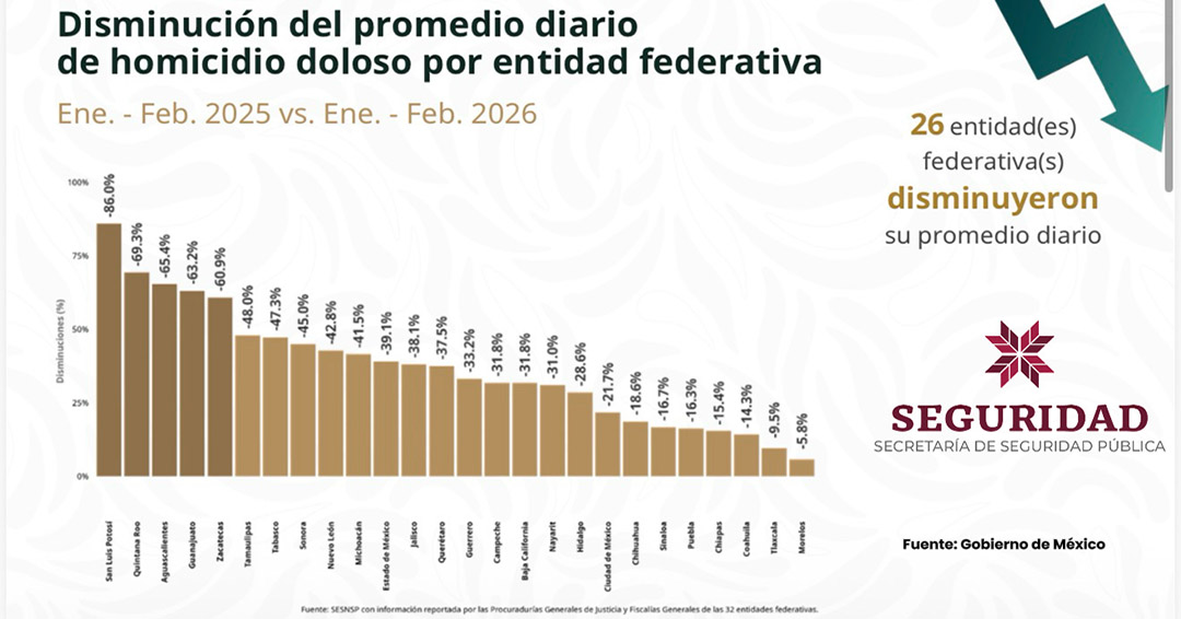 Derivado de la estrategia de seguridad del gobernador Julio Menchaca Salazar, el estado registró una disminución del 28.6 por ciento en el promedio diario de homicidios dolosos al comparar el primer bimestre de 2025 con el mismo periodo de 2026.