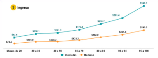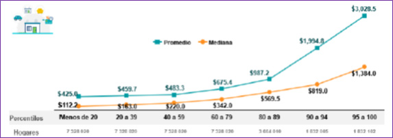 Fig. 1. Mediana y promedio de los ingresos corrientes efectivos totales anuales* de los hogares mexicanos, según percentil de la riqueza neta del hogar (en miles de pesos).