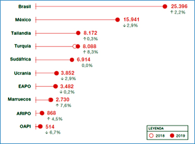 Entre las oficinas de determinados países de ingresos bajos y medios, Brasil (25 396); México (15 941); Tailandia (8 172) y Turquía (8 088); recibieron en 2019 un gran número de solicitudes de patente. Las oficinas de Turquía (+8.3%) y Marruecos (+7.6%) registraron en 2019 un crecimiento especialmente rápido. Entre las oficinas regionales, la Organización Regional Africana de la Propiedad Intelectual [ARIPO] con +4.5%, informó de un fuerte crecimiento; mientras que la Organización Africana de la Propiedad Intelectual (OAPI) con un -6.7%, experimentó una notable disminución. La Organización Euroasiática de Patentes (EAPO) con un -0,2%, también registró una pequeña disminución (OMPI, 2020).