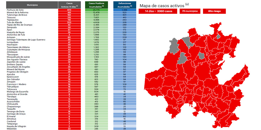 Pachuca con 873, Mineral de la Reforma con 491, Tizayuca con 315, Tula con 203 y Tulancingo con 182 son los cinco municipios con mayor cantidad de casos activos de Covid.