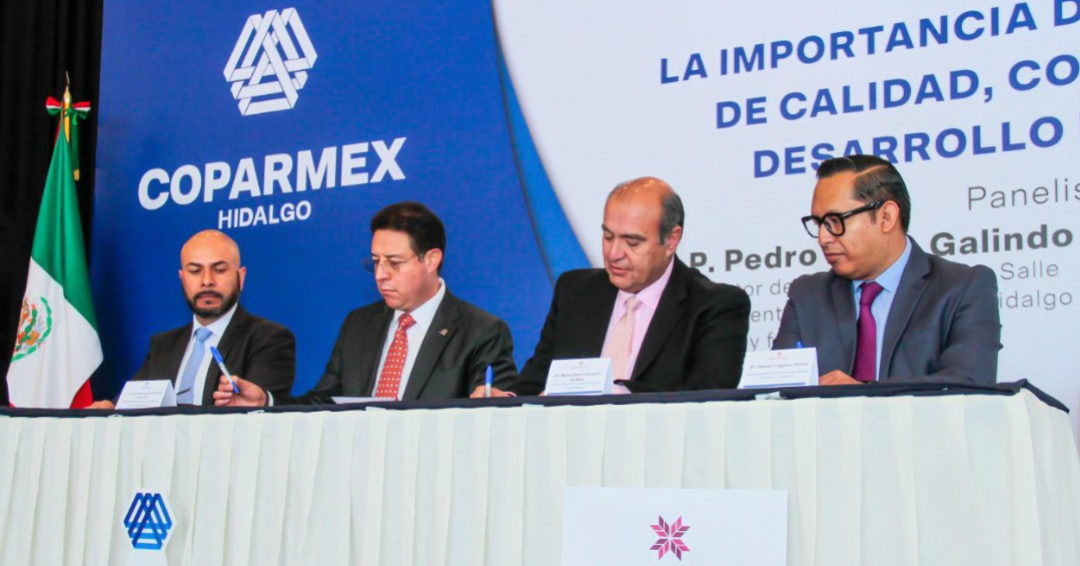 El secretario de Educación Pública de Hidalgo, Natividad Castrejón Valdez, junto con el presidente de la Confederación Patronal de la República Mexicana (Coparmex Hidalgo), Juan Manuel Batres Campos, signaron convenio de colaboración con el objetivo de establecer las bases de cooperación, coordinación y vinculación entre empresas e instituciones de educación superior.